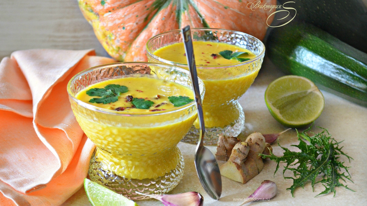 Поздней осенью, когда яркие краски за окном меркнут, особенно хочется продлить себе позитивное настроение. И в этом вам поможет яркий и согревающий крем-суп из тыквы! Добавив кабачок, чеснок, имбирь, карри, а также кокосовое молоко, вы получите прекрасное гармоничное сочетание —
