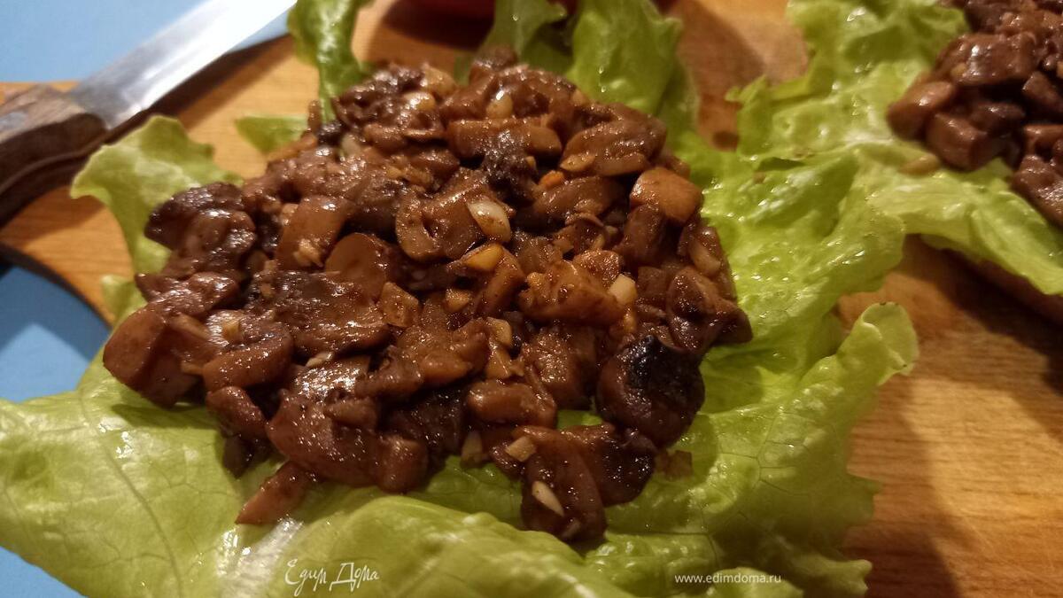 Вариант подачи в бургере. Грибы расположены на листе салата.