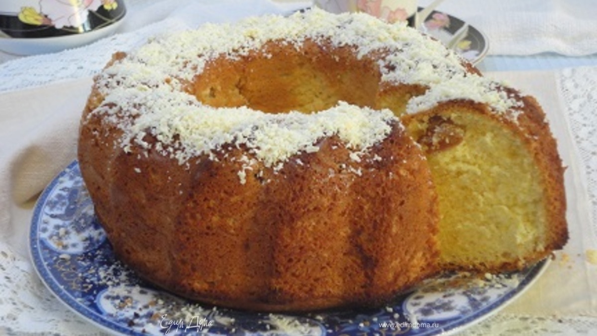 Готовый кекс оставить в форме на 10 минут, затем извлечь и окончательно остудить на решетке. Посыпать сахарной пудрой. В этот раз я перевернула его горячим и посыпала тертым белым шоколадом. Можно сделать и глазурь шоколадную или лимонную. Солнечное настроение получилось!