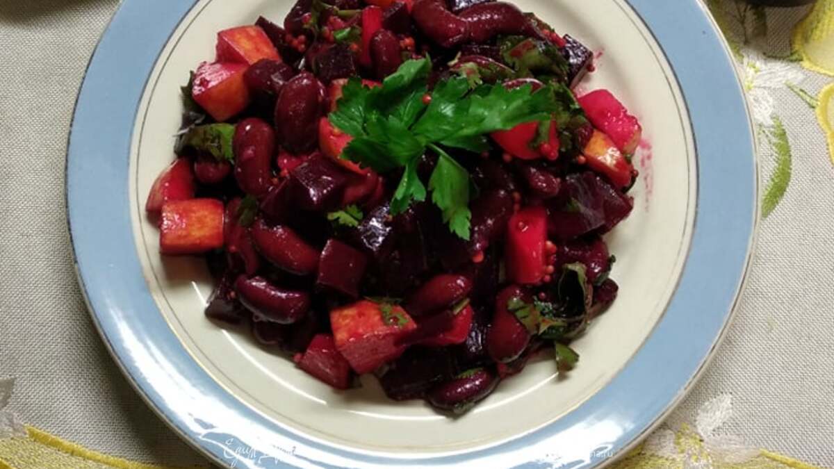 Соединяем фасоль, яблоки, свеклу с заправкой, добавляем петрушку. Все перемешиваем и при необходимости солим салат по вкусу. Приятного аппетита!