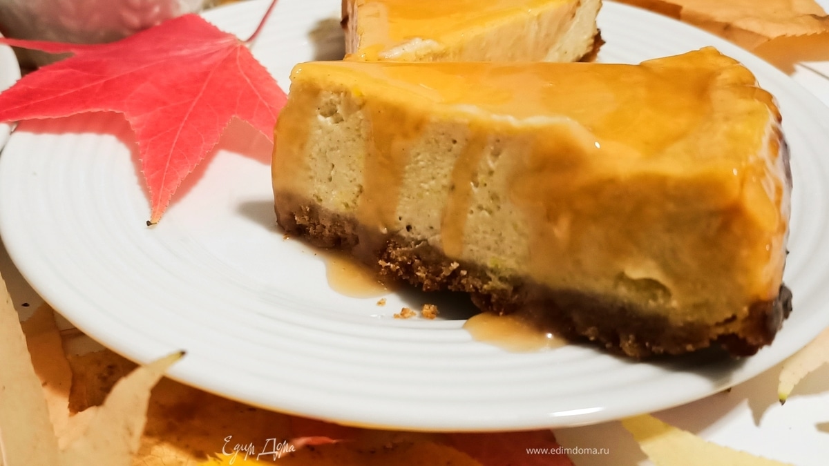 Чизкейк горячего приготовления с творожно-сливочным кремом, тыквой и карамелью на песочной основе.