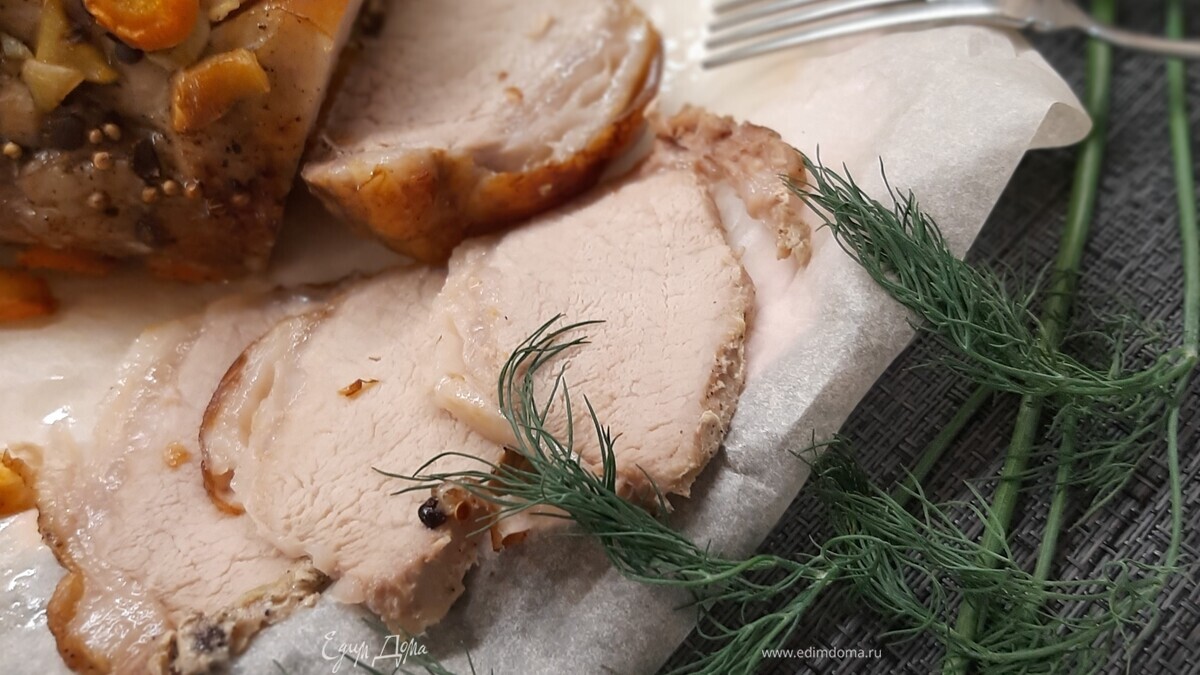 Обвалять кусок мяса в смешанных специях, затем положить его на чеснок и морковь, сверху посыпать оставшимися специями и овощами. Отправить в духовку на 1 час 15 минут. После указанного времени раскрыть фольгу, чтобы буженина подрумянилась, и запекать еще 10 минут. Приятного аппетита!