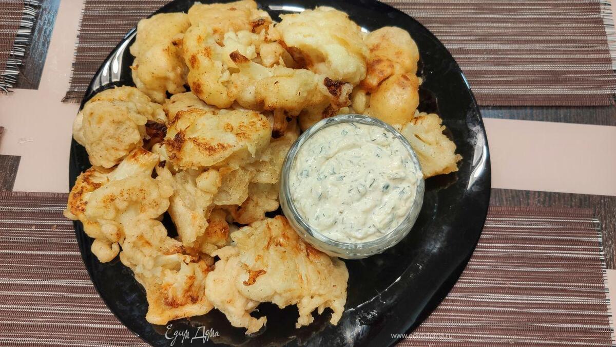 - Шаг 4Обвалять купусту в кляре и выложить в разогретую с большим количеством подсолнечного масла сковороду, перевернуть, как поджарится, и выложить на бумажное полотенце, чтобы стекло лишнее масло. Капусту закладывайте во фритюр небольшими порциями, чтобы она не слиплась. Подавать с соусом.