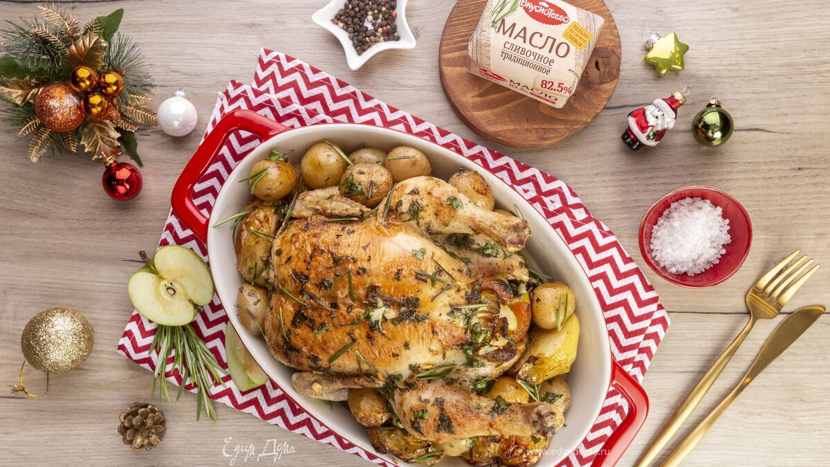 Переложите курицу на противень. Добавьте картошку, моченые яблоки и розмарин.