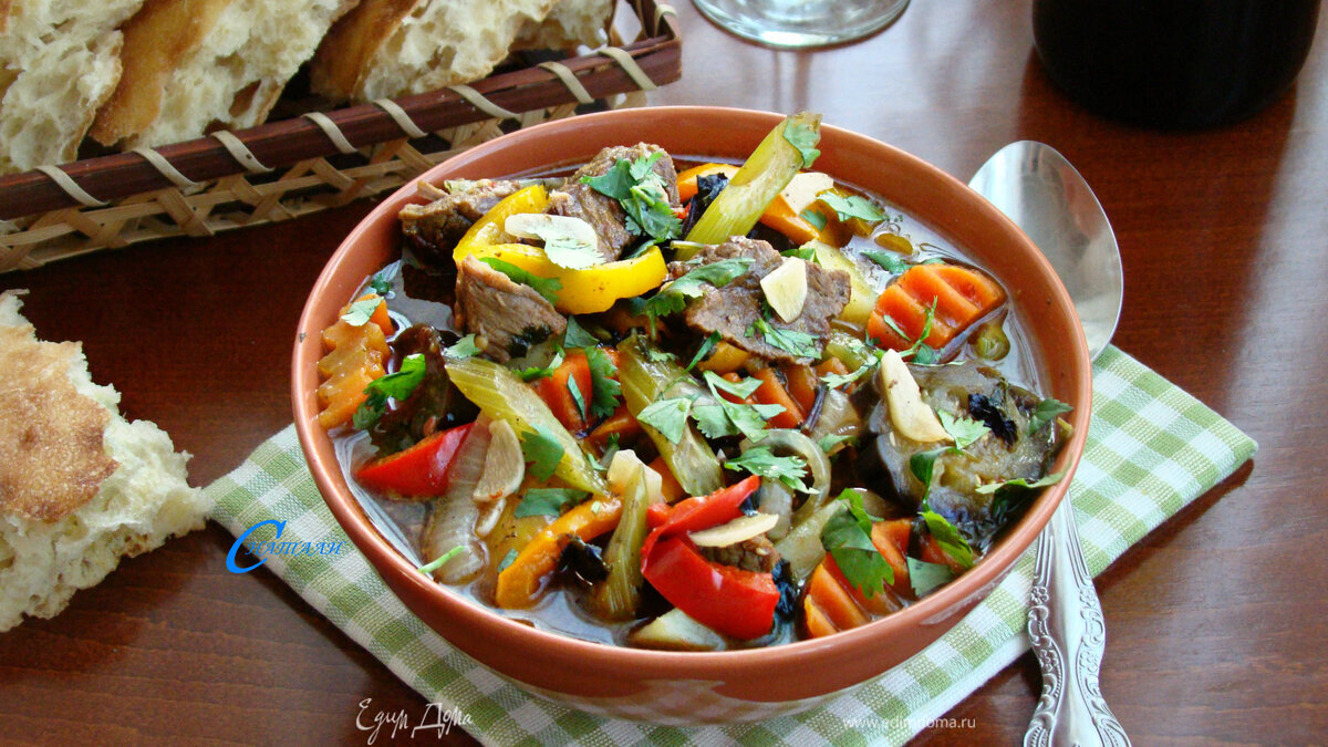 Вот и все — сытная, ароматная и очень вкусная хашлама готова! Перед подачей хашламу посыпать зеленью кинзы и базилика.
