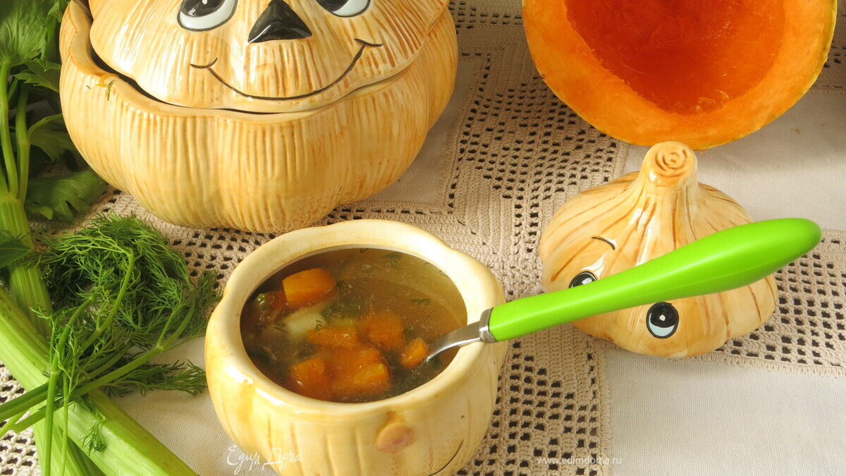 Легкий, но питательный суп на бульоне из цесарки с овощами — морковью, сельдереем и тыквой. Суп не пюрируется, тыква варится до мягкого состояния, придает сладости бульону. Приятного аппетита!