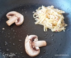 Шампиньоны нарезаем на слайсы. Сковороду смазываем растительным маслом. Кладем пластики грибов и сверху по 1–2 ст. л. картофеля.