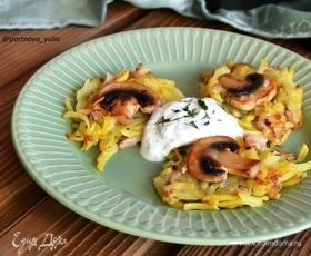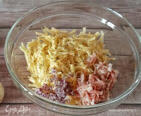 Сырой картофель натираем на крупной терке. Бекон режем мелкой соломкой. Красный или репчатый лук нарезаем максимально мелко. Все смешиваем в миске. Солим и перчим по вкусу, добавляем щепотку тимьяна и 1 желток.
