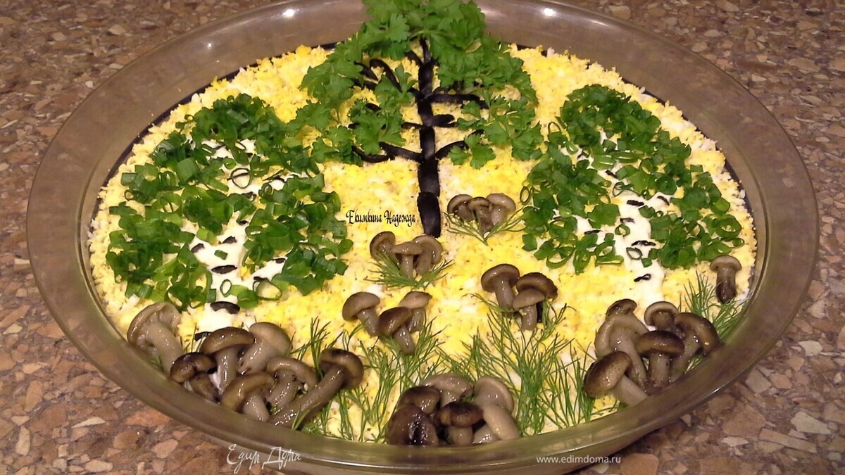 Уложила грибочки на желтки, как на лесную поляну. Веточка укропа будет травкой. Если лес — нужны деревья! Ствол дуба сделала из нарезанных маслин, крона — зелень петрушки. Стволы берез — майонез с обрезками маслин, крона — зеленый лук. Такой вкусный и красивый салат может украсить любой осенний праздник!