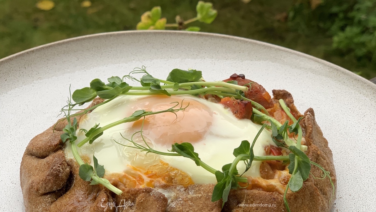 - Шаг 4Отправляем наши галеты в духовку, разогретую до 200°C, на 10 минут. Затем вбиваем в каждую по куриному яйцу и запекаем еще 10 минут. Готовые галеты смазываем сливочным маслом, украшаем зеленью и подаем к столу.