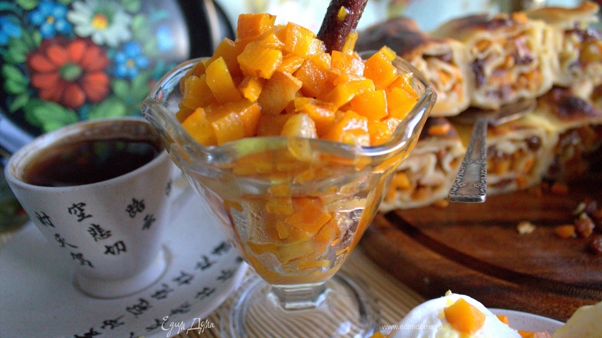 Полезный десерт из сезонных продуктов. Можно использовать как начинку, просто к чаю или полить на пломбир. Специи подойдут любые пряничные, с ними тыква пропитается и изменится по вкусу — детям пойдет на ура!