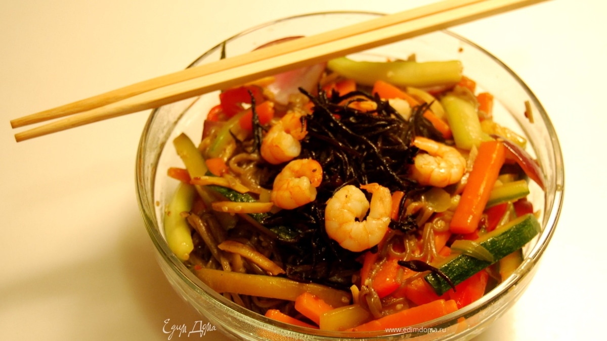 Японская жареная гречневая лапша с овощами и креветками.