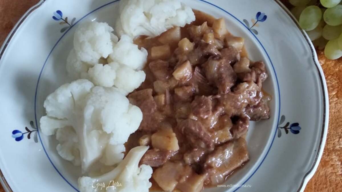 Айву промыть, обсушить, очистить от кожуры и, главное, сердцевины. Семечки айвы очень токсичные, могут даже вызвать отравление. Нарезать кубиком размером чуть меньше мясных. - Шаг 4Через 1 час тушения мяса (меньше, если у вас вырезка) добавить айву, жареный лук, томатную пасту и сушеный розмарин. Если есть свежий, то вообще замечательно! Продолжать тушить. Минут через 15 попробовать соус, при необходимости добавить сахар. Тушить мясо до готовности. У меня тушилось еще около 1 часа. При необходимости добавить еще воды. Но только кипящей! В конце тушения посолить и поперчить по вкусу. Подавать с любимым гарниром. У меня — цветная капуста. Очень хорошо сочетается с картофельным пюре. Можно посыпать зеленью. Приятного аппетита!