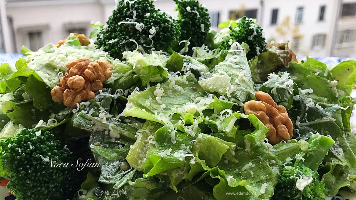 Зелень вымыть и дать стечь воде. У меня для этого специальная сушилка для зелени, но можно разложить на бумажное полотенце и подождать, пока оно впитает влагу. Брокколи разобрать на соцветия. Стебель сельдерея у меня совсем малыш, так как он имеет специфический вкус и может перебить остальные вкусы в салате, но вы делайте по желанию. - Шаг 2