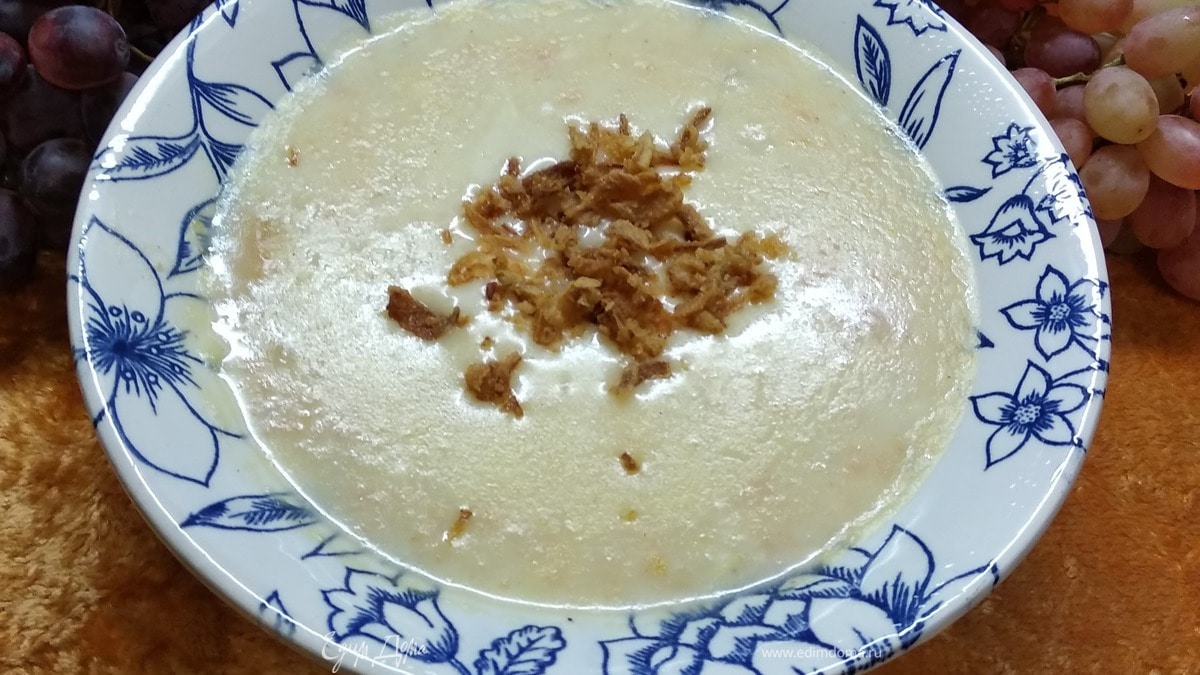 Если у вас нет жареного лука, берете одну луковицу, режере на тонкие кольца, обваливаете в муке и обжариваете на оливковом (растительном) масле до хруста. Подаем суп, посыпав луком. Приятного аппетита.