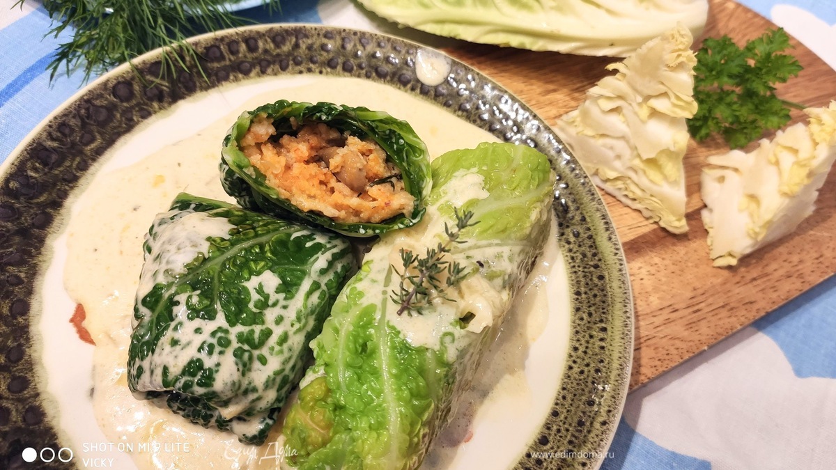 На этот раз классический голубец обретает новую роль и демонстрирует свой вегетарианский талант. С белым винным соусом получается невероятно хорошо!
