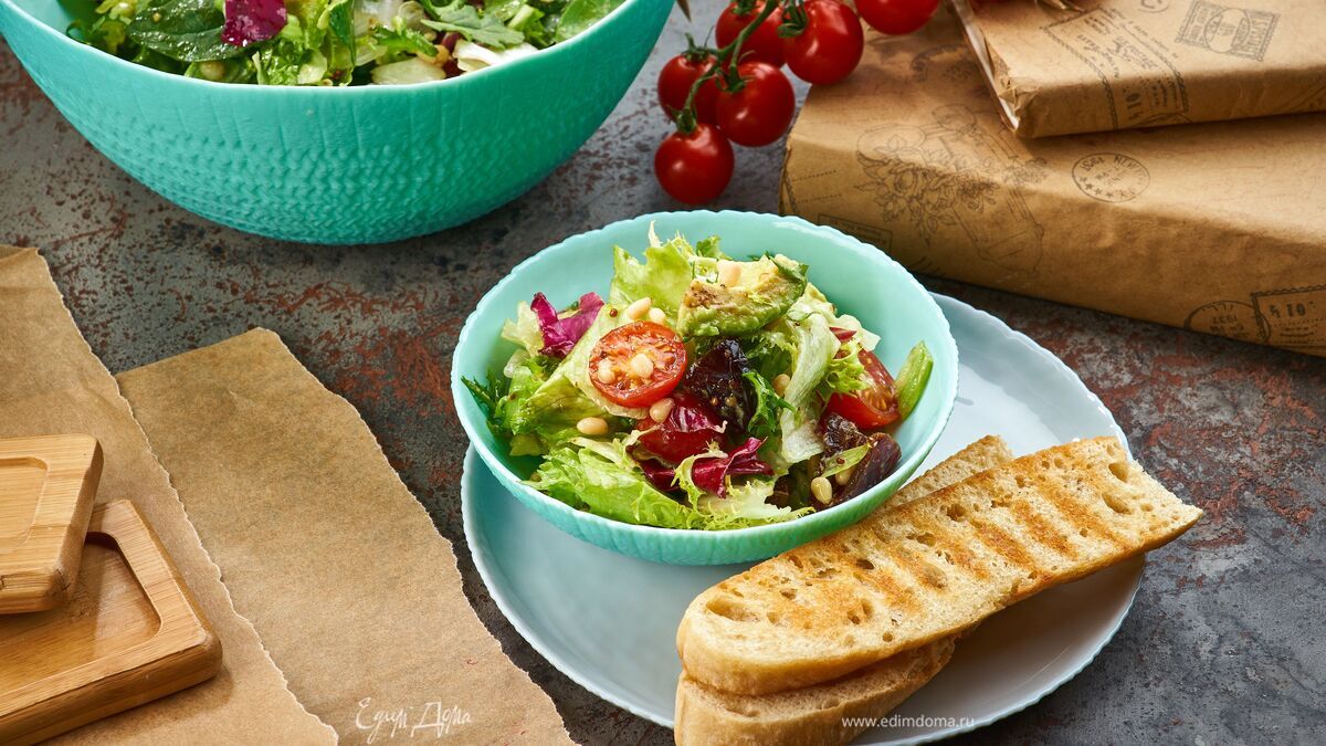 К салатному миксу добавьте авокадо, черри, финики и кедровые орехи.