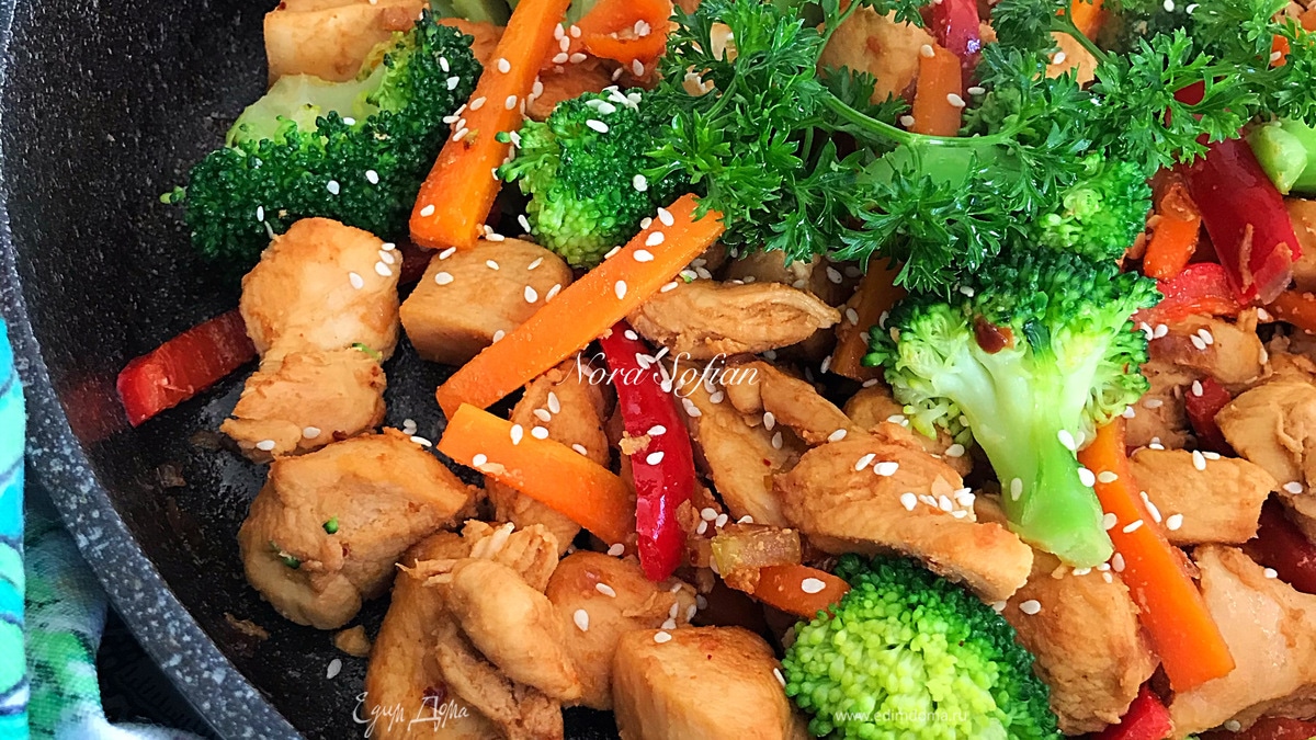 В сковороде с толстым дном разогреть масло и обжарить филе до готовности. Потом добавить лук, чеснок. Перемешать и потушить одну минуту. Затем добавить морковь, перец, сельдерей, соевый соус, перемешать и потушить еще пару минут. В конце добавить брокколи, перемешать и снять с огня. - Шаг 5