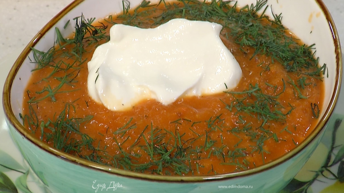Разлить в тарелки суп, добавить по ложке сметаны и посыпать измельченным укропом.