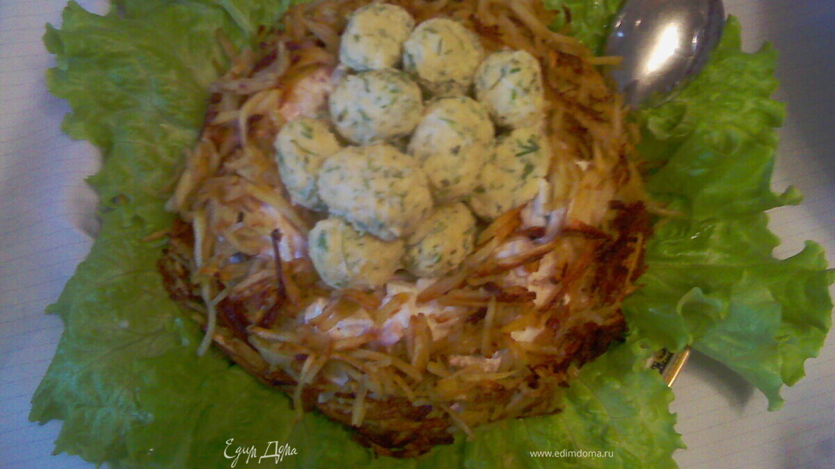 - Шаг 4устелить блюдо вымытыми и просушенными листьями салата. на них в форме гнезда выложить мясную основу салата с небольшим углубление в центре. оформить салать жареным картофелем, в центр гнезда выложить яйца