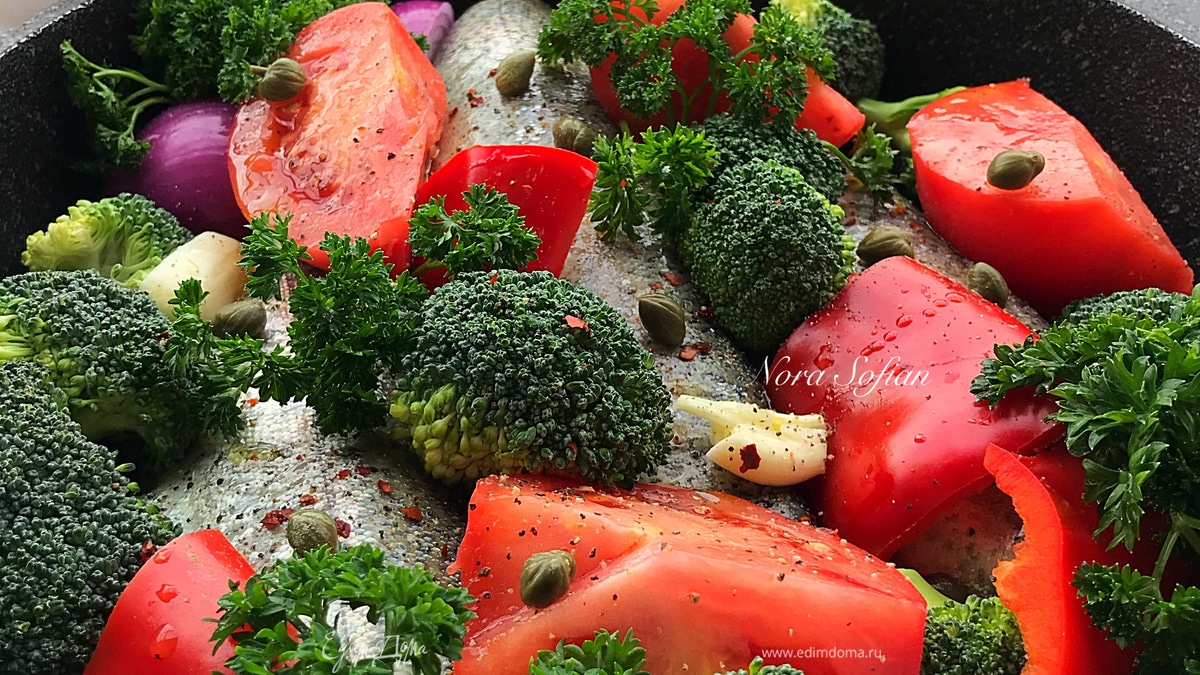 Подготовить овощи. Брокколи разобрать на соцветия. Все овощи вымыть и крупно нарезать. В сковороду с толстым дном налить масло, далее в сковороду выкладываем рыбу, овощи, петрушку и каперсы. Полить все вином, посолить, поперчить, накрыть крышкой и поставить на огонь. Готовить до готовности 15–20 минут, в зависимости от размера рыбы. - Шаг 3