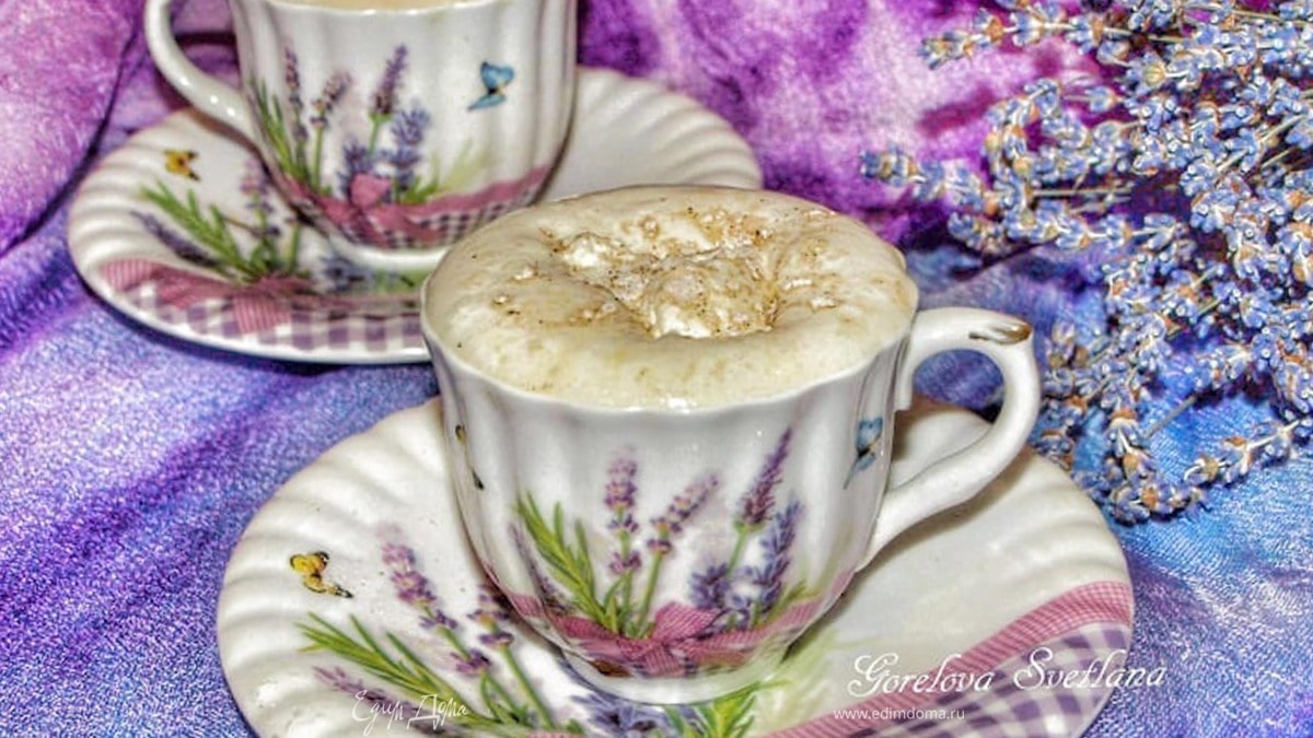 Смешать молотый кофе и цветки сушеной лаванды. Приготовить кофе любым удобным вам способом. Растворимый кофе не подойдет для этого напитка. Если кофе готовился в турке, то его надо процедить. Сливки взбить. - Шаг 2