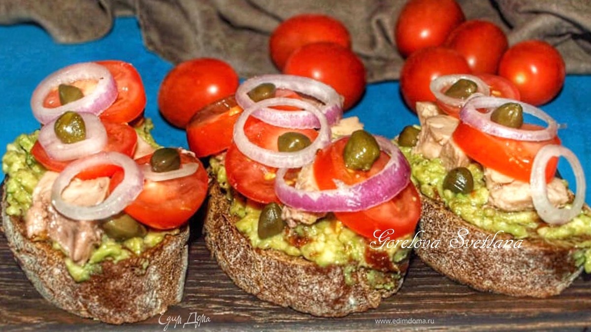 Брускетты с авокадо, печенью трески и помидорами