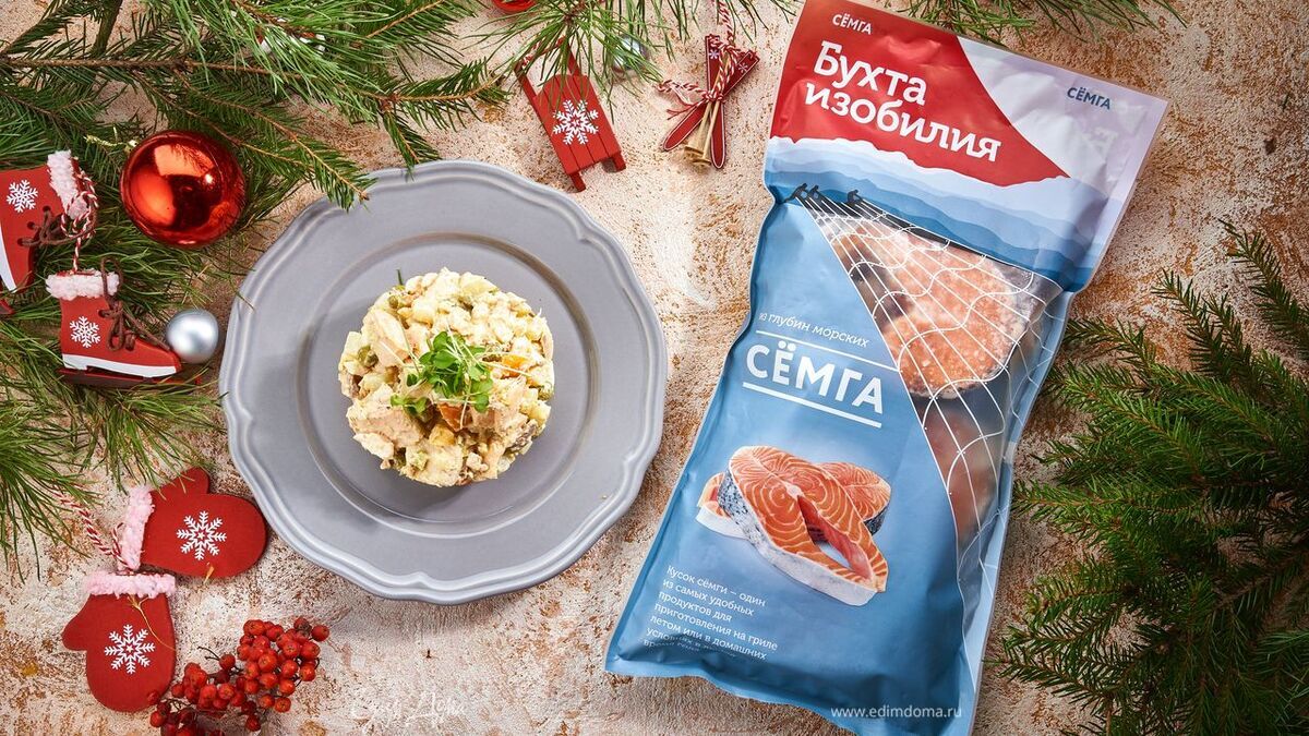 Оливье с запеченной красной рыбой