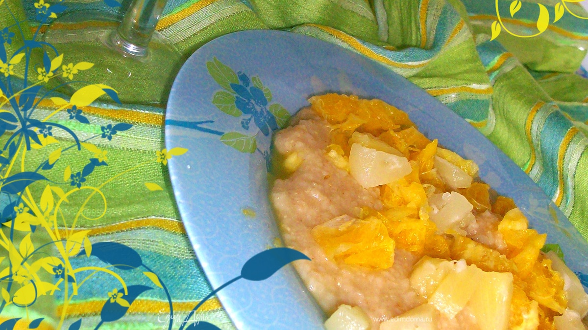 Мелко нарезать апельсины. Кинуть их на раскаленную сковороду, чтобы они выпустили сок. После этого добавить немного сахара и готовить несколько минут. Смешать апельсины с готовой кашей, украсить ананасами.