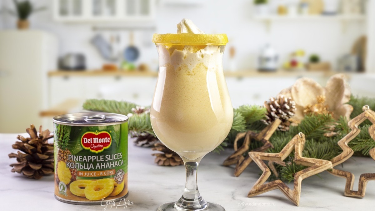 Украсьте коктейль кольцом ананаса и взбитыми сливками.