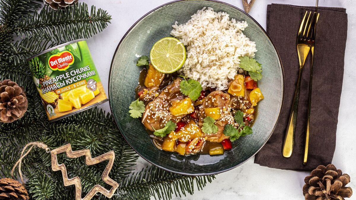 К овощам выложите кусочки ананасов в соке Del Monte (435 г). Все перемешайте.