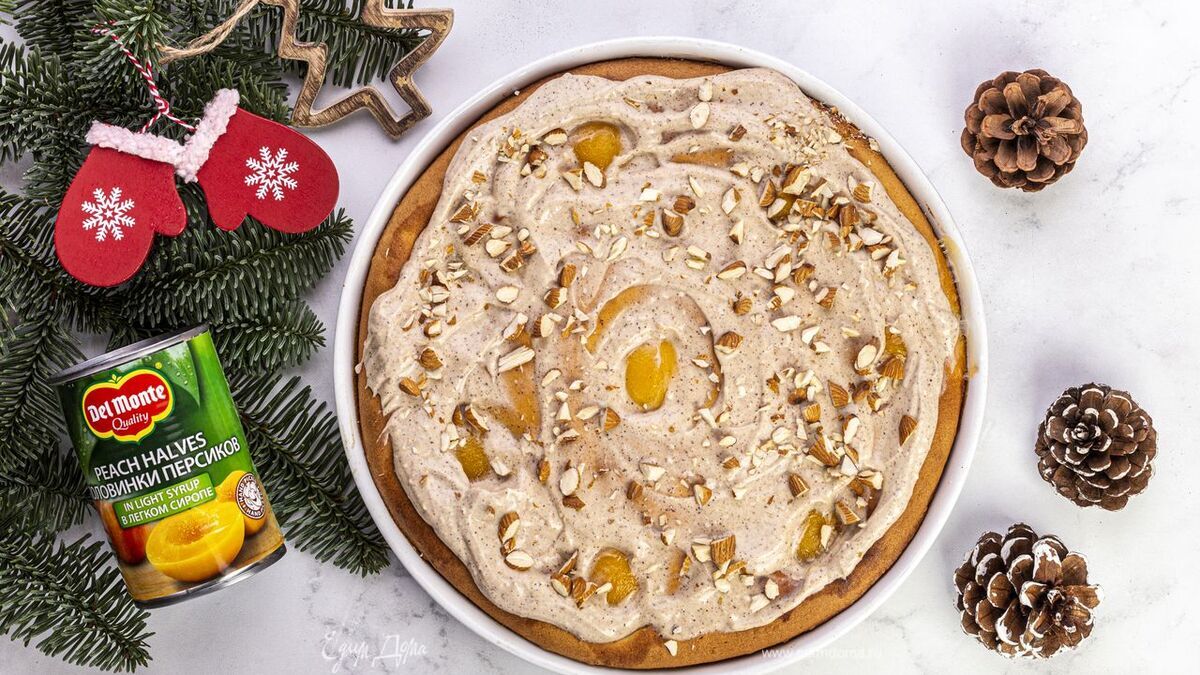 Форму выстелите пекарской бумагой. Вылейте получившееся тесто. Половинки персиков в легком сиропе Del Monte (1 банка — 420 г) выложите на тарелку и дайте стечь лишней жидкости. Выложите персики на тесто и слегка притопите. Посыпьте корицей. Выпекайте пирог 40 минут при 180°C в заранее разогретой духовке. - Шаг 6