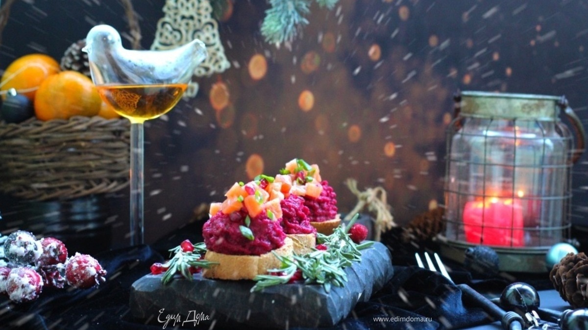 Свекольный крем слегка придавить ложкой, чтобы вышло немного лишней жидкости. Поместить в кондитерский мешок. На кусочки хлеба выложить свекольный крем, сверху уложить кубики лосося. Посыпать измельченным зеленым луком. Подавать сразу.