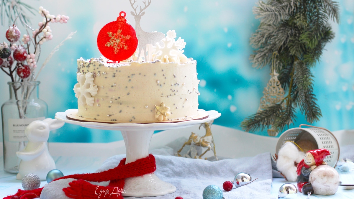 Утром достать торт. Смазать бока и верх кремом, выровнять спатулой. Декорировать по своему усмотрению. Я посыпала сахарными шариками, вырезала снежинки. В центре сделала карамельный шар в силиконовом молде. Олень — готовый топпер. - Шаг 8