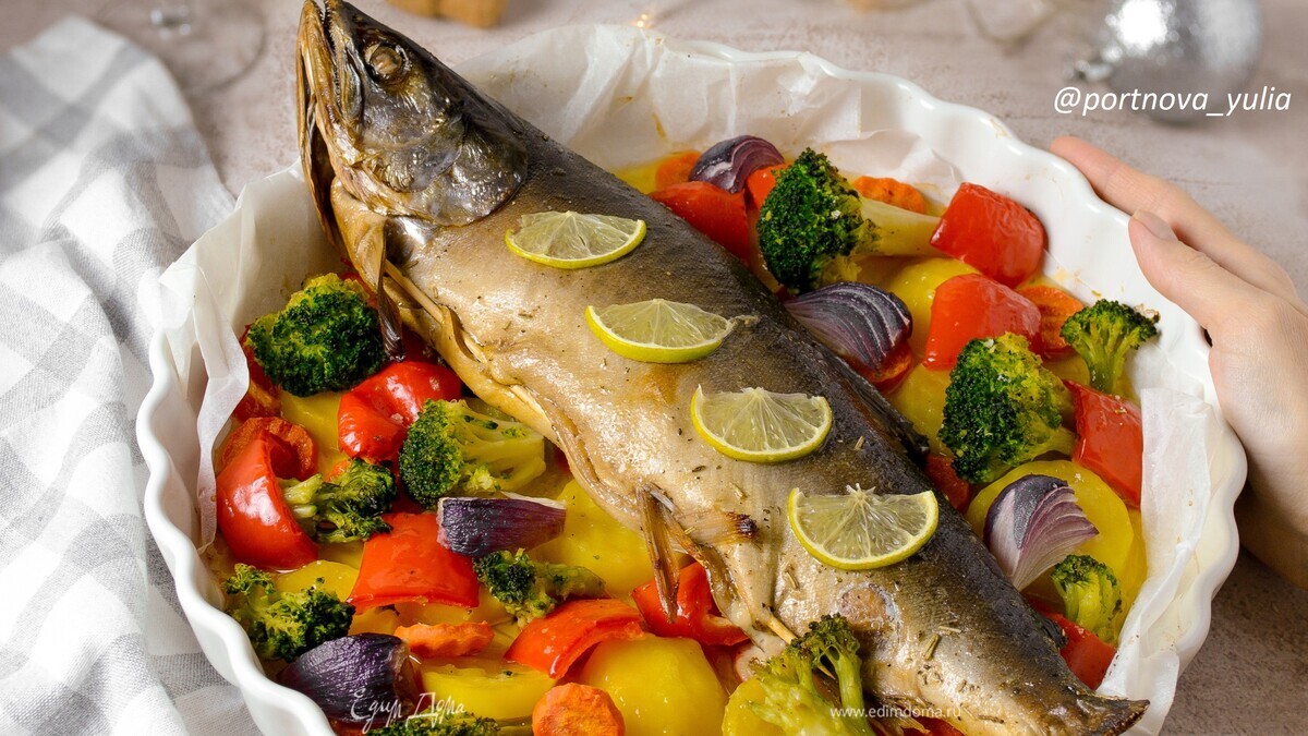 Сбрызгиваем все оливковым маслом. Запекаем в хорошо прогретой духовке при температуре 190°C около 35–40 минут. Длительность будет варьироваться в зависимости от размера вашей рыбы. Приятного аппетита!