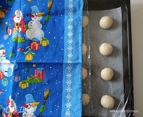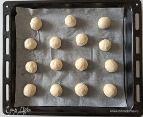 Разделить тесто на небольшие кусочки примерно по 30 г. Скатать шарики. Выложить их на противень, предварительно застелив его пергаментной бумагой.