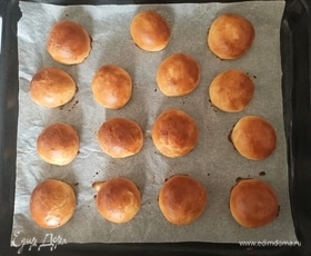 Желток смешать с молоком и смазать верх булочек. Выпекать в предварительно разогретой до 180°C духовке в течение 15–18 минут.