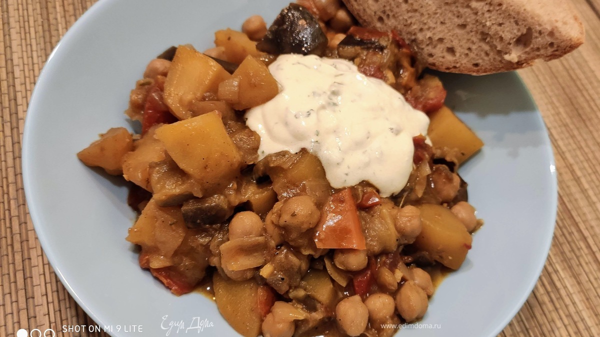 Очищенный картофель нарезать на порционные кусочки, выложить в кастрюлю, затем добавить нарезанные помидоры и баклажаны, а также сваренный заранее или консервированный нут. Все хорошо перемешать и тушить под крышкой в разогретой в течение 30–45 минут. При необходимости добавить еще немного овощного бульона. У нас кастрюля после готовности блюда стояла еще некоторое время, и рагу получилось кремовым и нежным. - Шаг 3