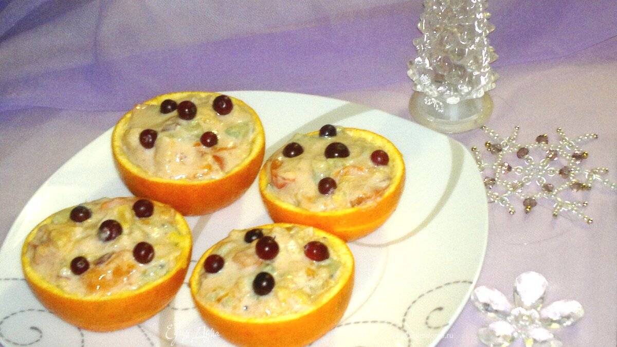 Легкий фруктовый салат можно подать в качестве десерта в новогоднюю ночь. Я думаю, гостей привлечет необычная подача салата — в половинках апельсина. Для приготовления можно