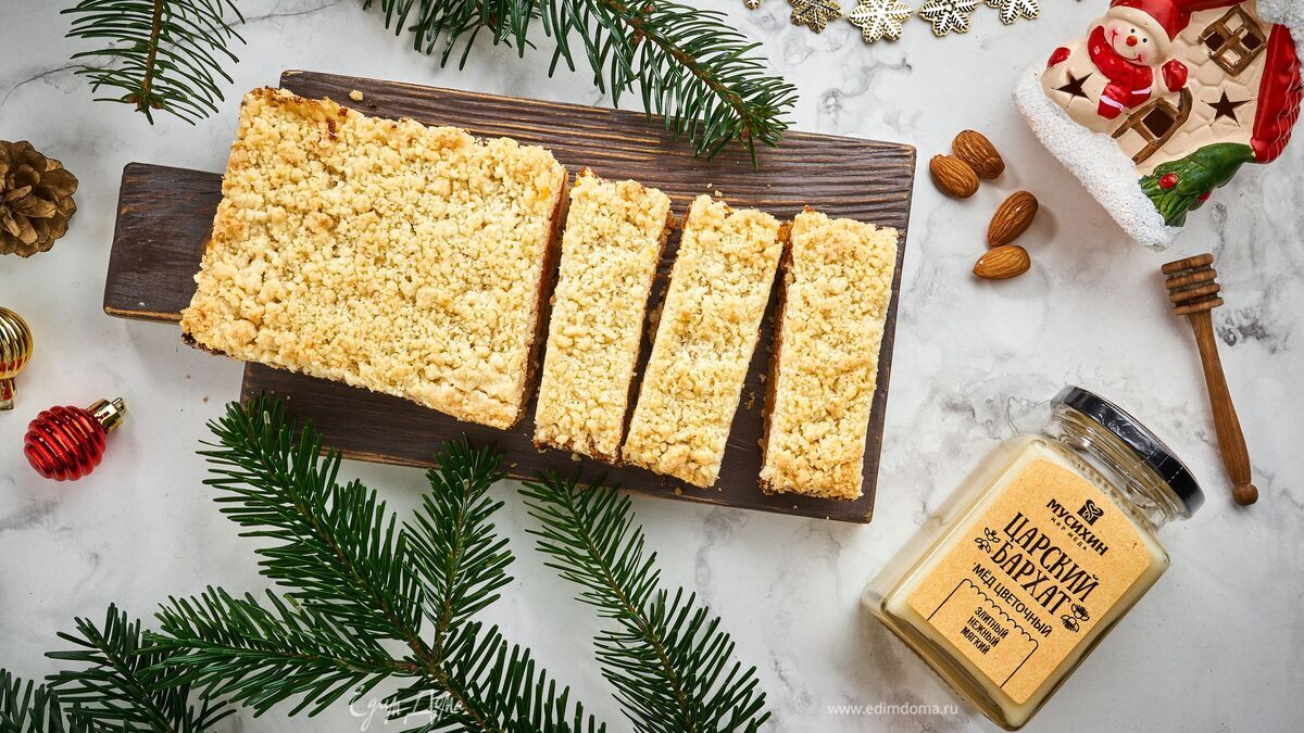 Поверх начинки выложите штрейзель. Выпекайте десерт 20 минут при 180°С до румяного цвета. - Шаг 11