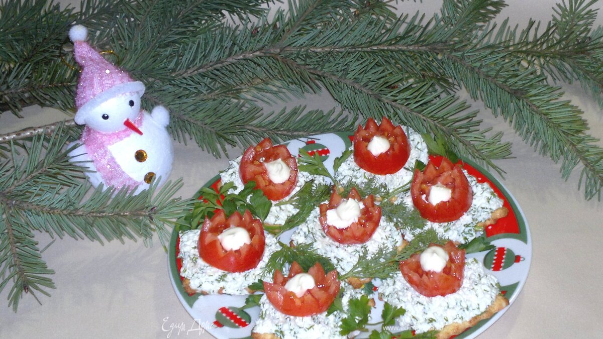 Быстрая в приготовлении закуска из простых ингредиентов станет украшением новогоднего стола. Закуску можно подавать на крекерах, галетах, поджаренных кусочках хлеба. Творожную массу лучше приготовить заранее, а намазать непосредственно перед подачей на стол, чтобы не размокла основа.