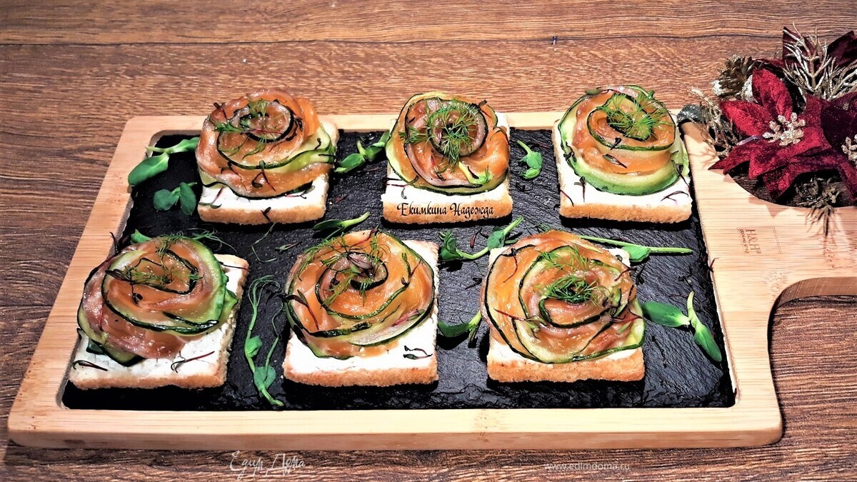 На сыр накрутите розочки из рыбы с огурцом. Не тартинки, а блаженство! Очень хорошее сочетание вкусов! С наступающим Новым годом!