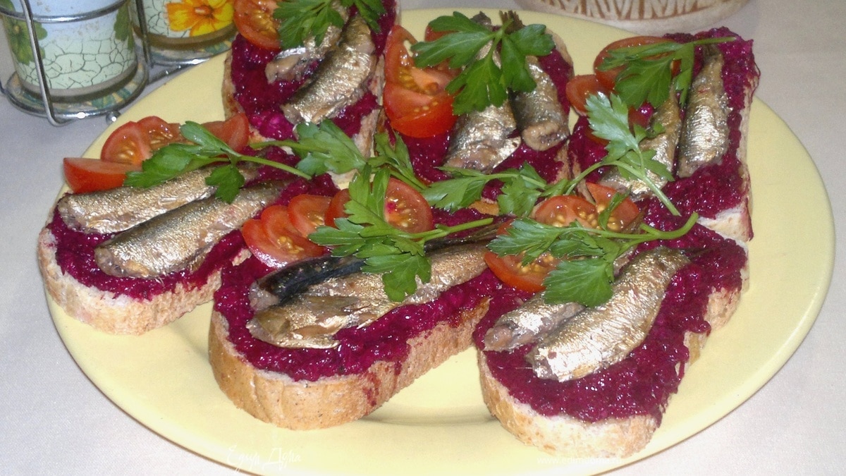 Подать тосты со шпротами и свеклой на праздничный новогодний стол. Приятного аппетита! С наступающим Новым годом!