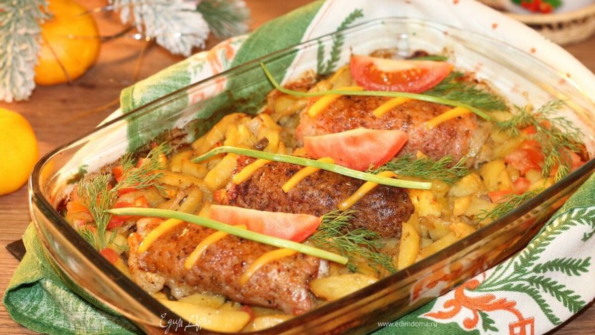 Сочные свиные отбивные с начинкой и ароматный картофель. Блюдо готовится в духовке.