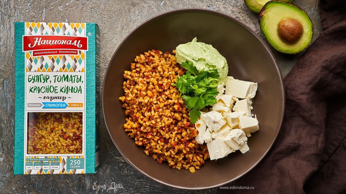 Боул с булгуром, томатами и красным киноа, брынзой и соусом из авокадо