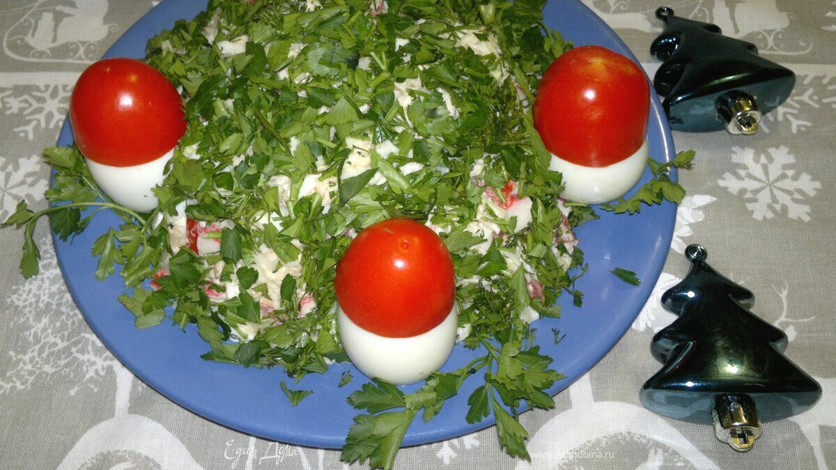 Легкий овощной салат с яйцами и крабовыми палочками. Его можно подать на праздничный новогодний стол. Готовится быстро, выглядит красиво.