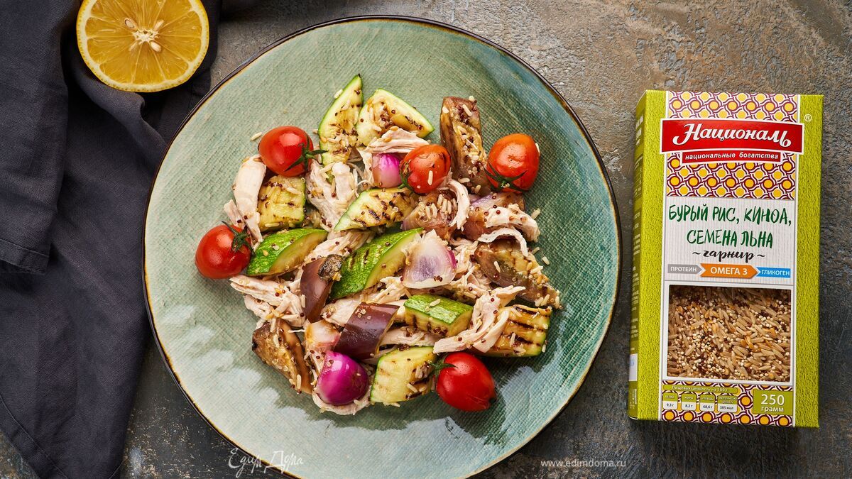 Теплый салат с бурым рисом, киноа, семенами льна и курицей