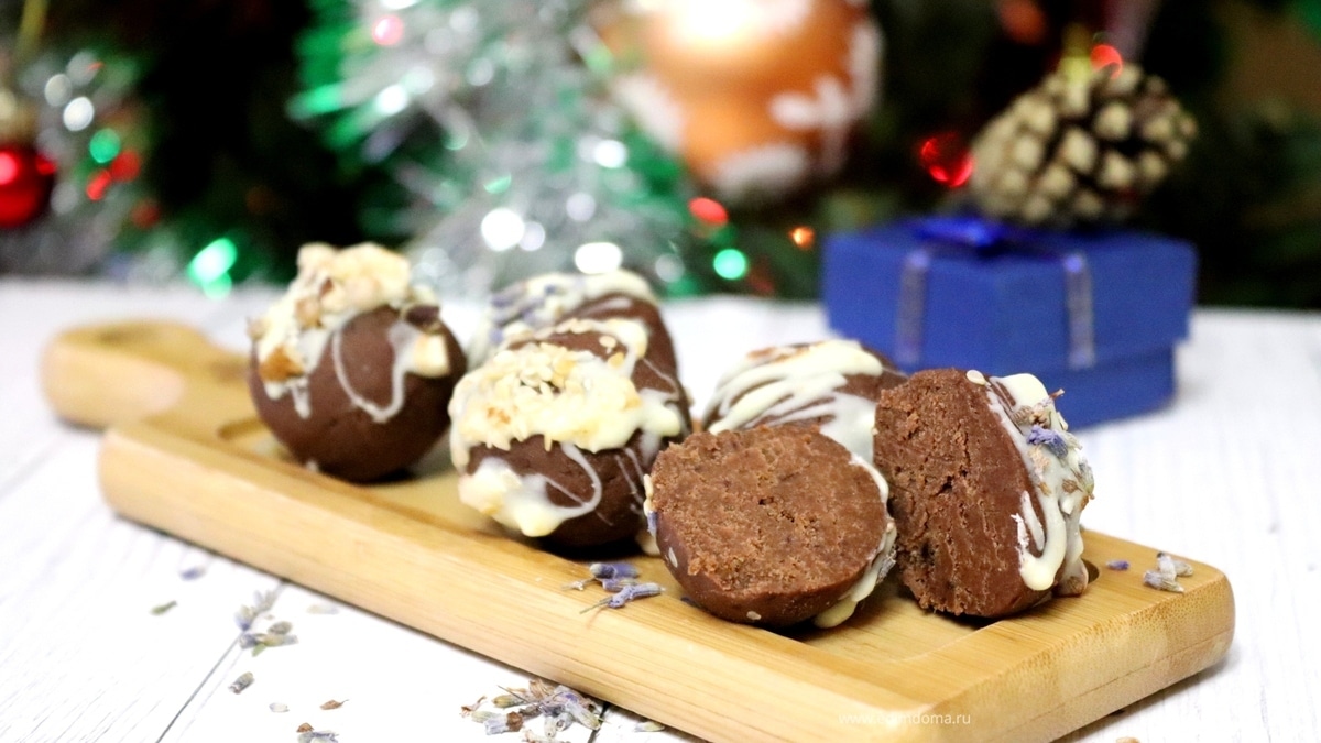 — 15 г, из этого количества ингредиентов получилось 13 штук. Украсить по желанию. Я полила растопленным белым шоколадом и посыпала кунжутом, грецкими орехами и бутонами лаванды. - Шаг 10