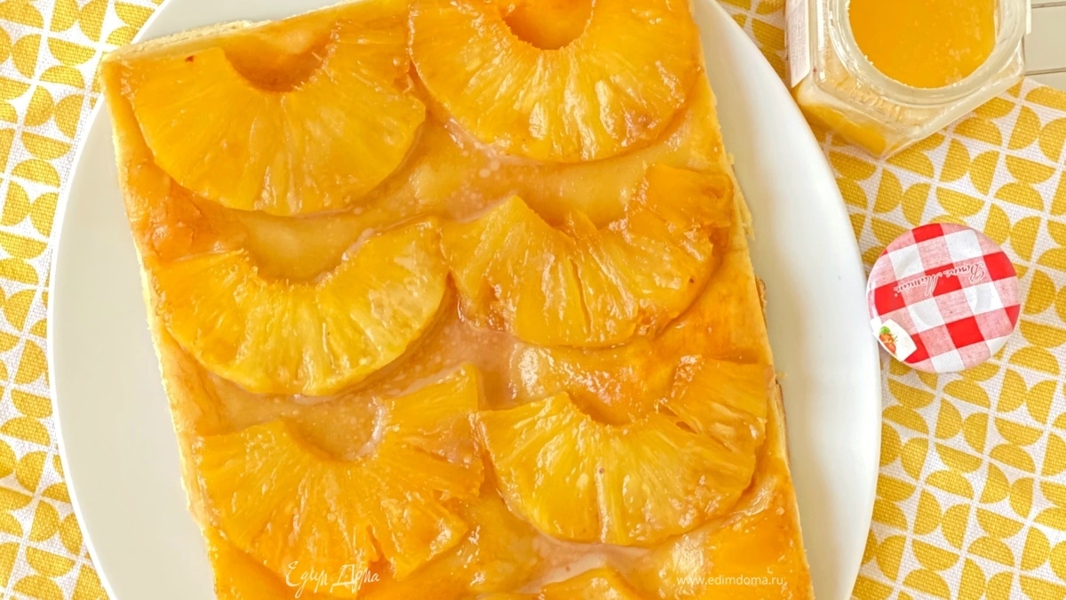 Сверху накрыть тестом, раскатав его в пласт толщиной 5 мм. Выпекать 18–20 минут при 230°C до золотистой корочки. Перевернуть готовый пирог на блюдо фруктами вверх.