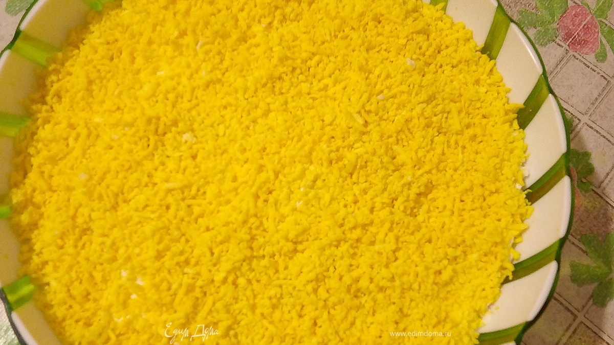 Желтком посыпаем сверху, это завершающий шестой слой. Майонезом промазывать уже не нужно. - Шаг 13
